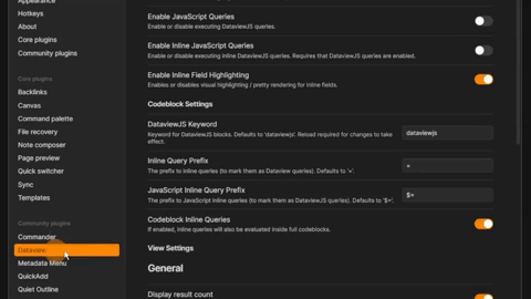 Before creating any queries I turn on the dataview js option. This allows javascript to be used. My main use case is so other plugins can use all of dataview’s features.